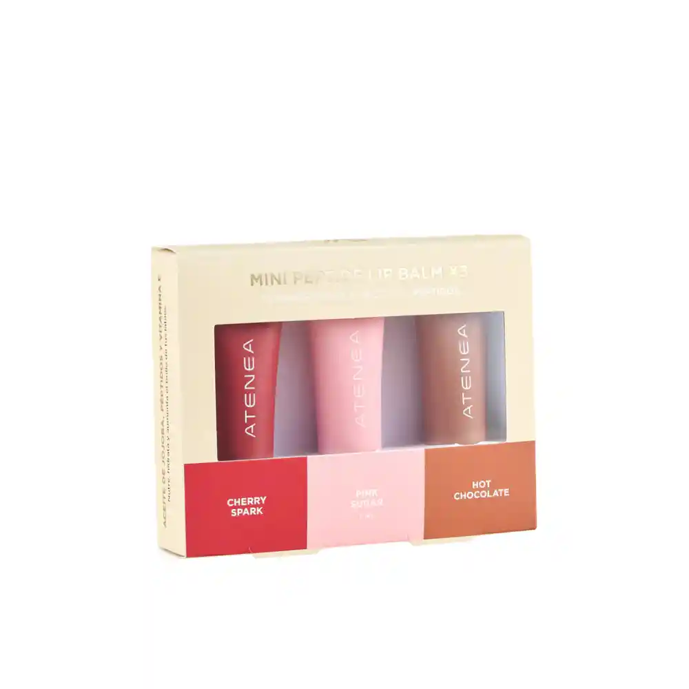 El Mini Peptide Lip Balm x3 de Atenea es un set que reúne tres de los tonos más vendidos de la línea en un práctico formato viajero. Su fórmula enriquecida con péptidos y activos nutritivos cuida los labios en cada aplicación, aportando un brillo confortable y una sensación jugosa que se percibe al instante. Es la opción ideal para llevar a todas partes o regalar, combinando funcionalidad, estética y tratamiento en un solo producto. Tonos incluidos: -Pink Sugar: rosa claro con brillo sutil y aroma a algodón de azúcar - Cherry Spark: rojo cereza con brillo vibrante y aroma dulce a cereza. - Hot Chocolate: nude café suave con brillo natural y aroma a chocolate.