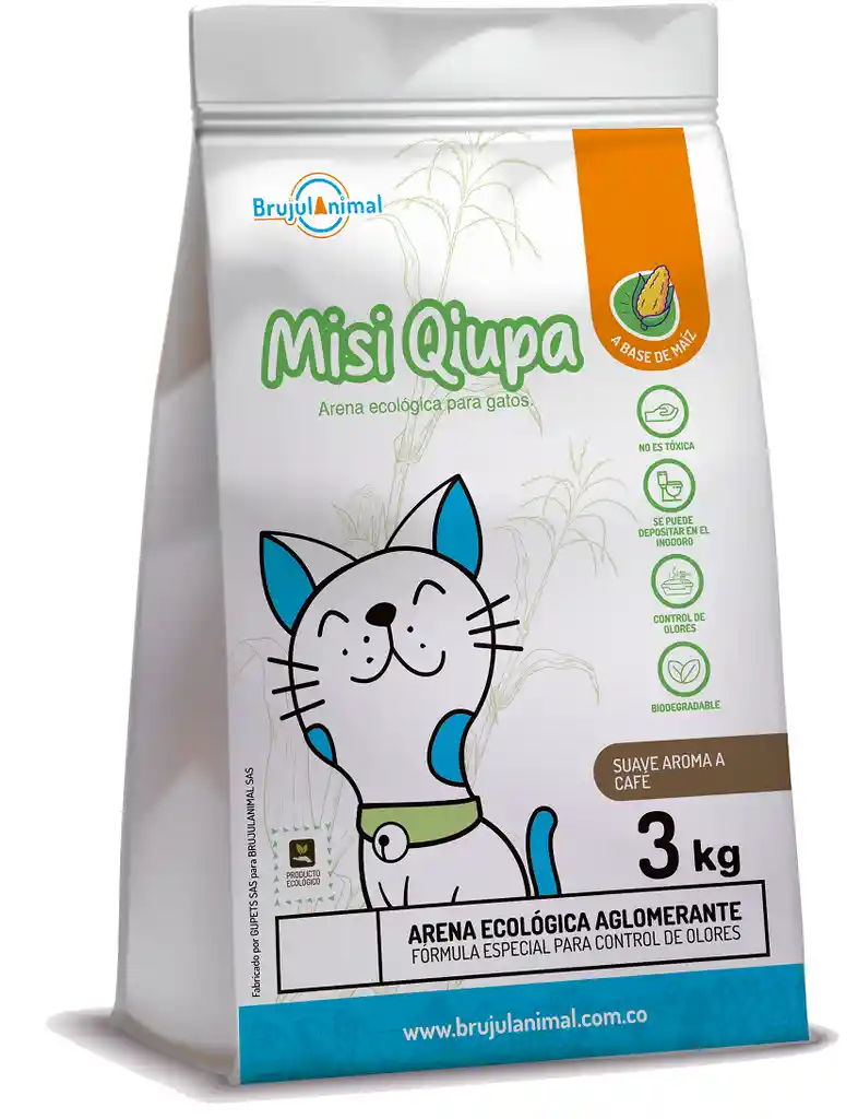 Arena Ecológica Misi Qupa es un producto innovador que combina harina de maíz con una fórmula especial para aromatizar, disminuyendo los olores y mejorando la aglomeración. Su composición hipoalergénica, libre de polvo, no tóxica y biodegradable, la convierte en una opción ideal para los propietarios de mascotas que buscan un producto amigable con el medio ambiente. La arena Misi Qupa de 3 kg dura aproximadamente 25 a 30 días para 1 gato y 12 a 15 días para 2 gatos.