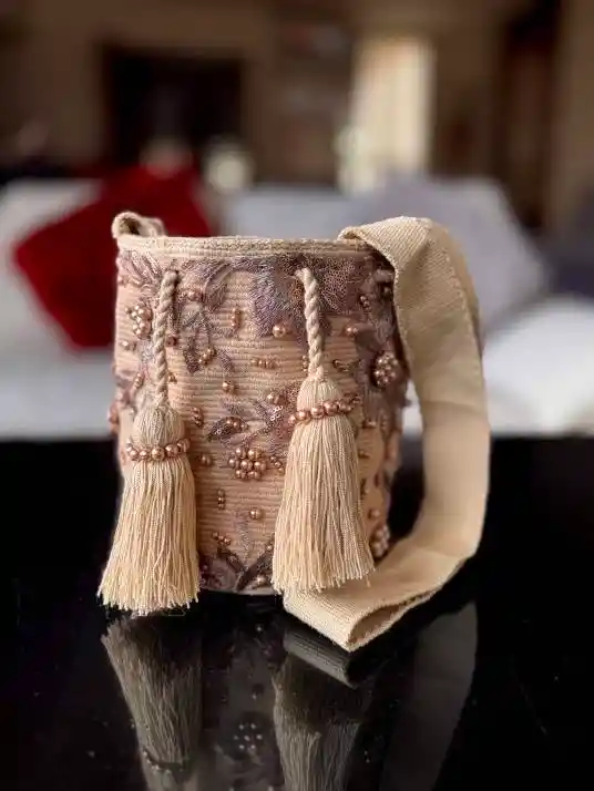 Mochila Wayuu recamada, elaborada por artesanos de la rancheria chispana