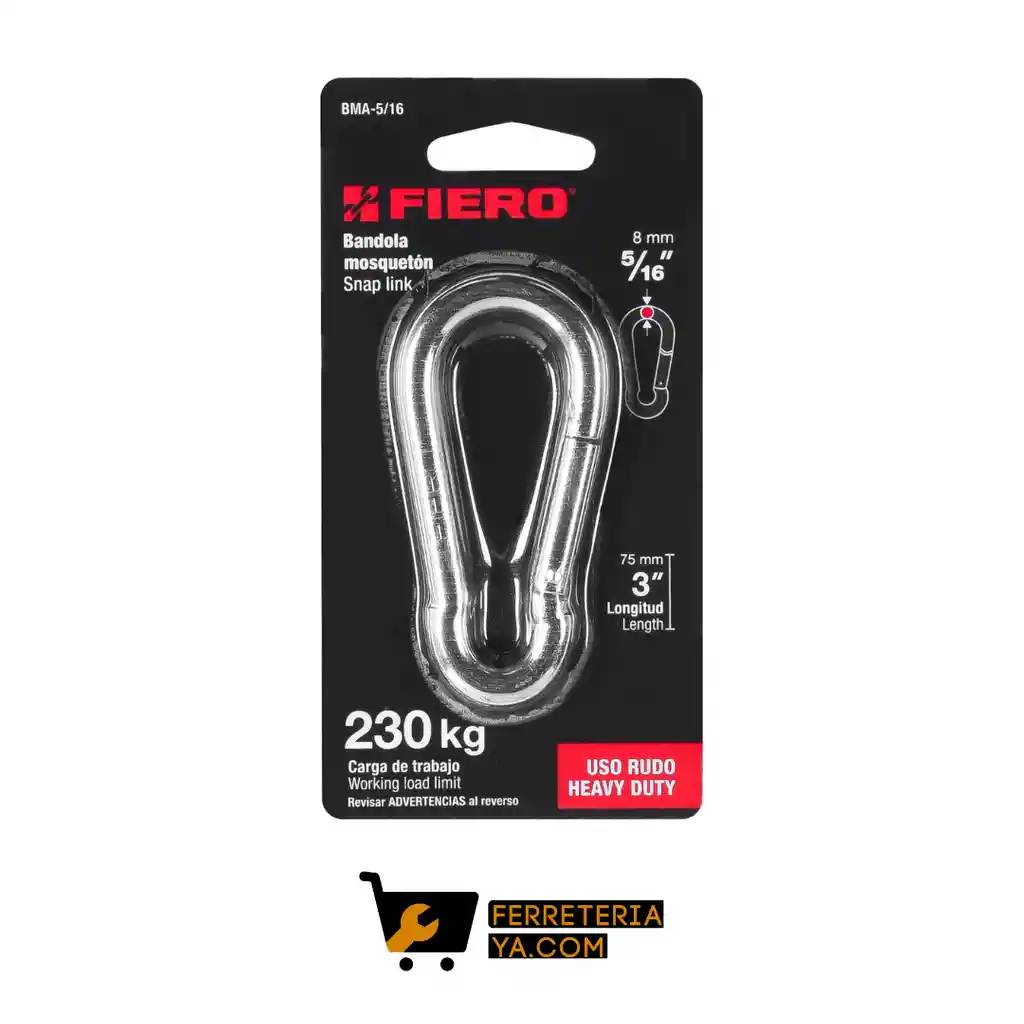 Mosquetón pera de acero 5/16" con seguro de gancho, Fiero - 44039 CARACTERÍSTICAS • Fabricado en acero al carbono, acabado galvanizado • Cierre fácil y rápido • Resistente a la corrosión • Ideal para conexión instantánea de cables y cuerdas • *No exceder límite marcado