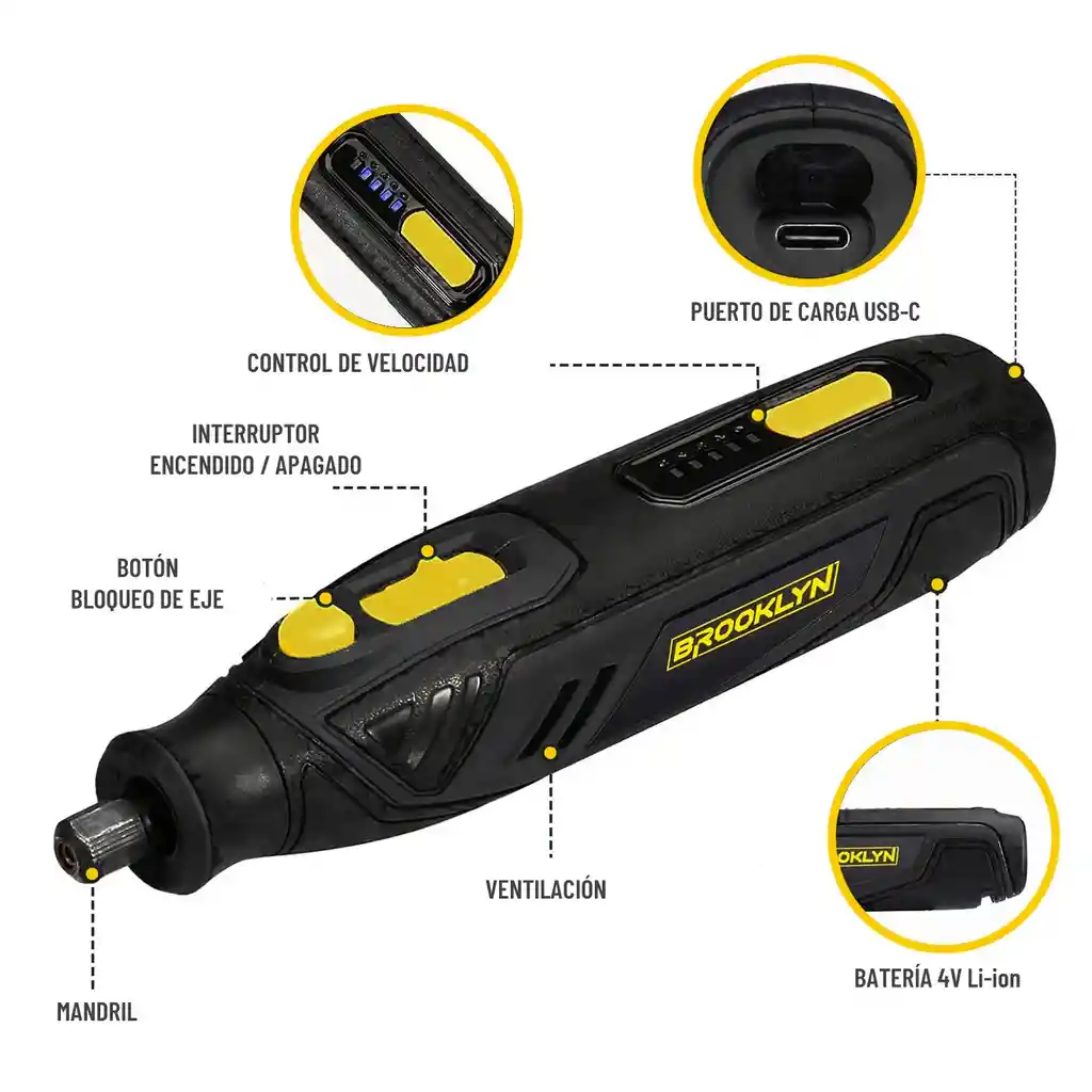 Herramienta rotativa multipropósito BROOKLYN Tipo Dremel - Herramienta inalámbrica recomendada para trabajos de corte, moldeado y pulido de precisión. - Por ser Inalámbrica es más liviana, más cómoda y fácil de usar. - Con la variedad de accesorios que incluye se ajusta al proyecto o trabajo que quieras realizar. - Incluye caja para guardar todos los accesorios en un solo lugar. ----------------------------------------------------------------------- FICHA TÉCNICA: - Herramienta rotativa multipropósito inalámbrica. - 5 velocidades. - Batería recargable: 4V Li-ion 2000 mAh - Voltaje de carga: USB 5 V DC - Cable de carga: USB-C Cord - Tiempo de carga: 2 - 3 horas - Velocidad sin carga: 5000 - 25000 rpm - Diámetro máximo del disco: 35 mm - Capacidad del mandril de resorte: 3,2 mm máximo - Medidas herramienta: 18,5 x 3,4 cm - Medidas maleta: 23 x 12,5 x 5,5 cm - Peso: 260 gr - Producto no funciona si es que se encuentra enchufado ----------------------------------------------------------------------- MODO DE USO 1.- Asegúrate que la herramienta esté cargada. Si no lo está, en la parte posterior, tiene su puerto de carga USB-C. 2.- Elige la punta que desees usar y gira el mandril para soltarlo. 3.- Inserta la punta que vas a usar y manteniendo el botón amarillo superior apretado (bloqueo de eje), gira nuevamente el mandril en sentido contrario para apretarlo hasta que el botón amarillo baje y haga click. 4.- Enciende la herramienta empujando su interruptor, elige la velocidad con la que desees trabajar ¡y listo! ----------------------------------------------------------------------- QUE VIENE EN LA CAJA - 1 herramienta rotativa inalámbrica - 1 base de caucho para montar bandas de lijar. - 10 discos de corte reforzados con fibra de vidrio. - 10 papel de lija redondos. - 2 ruedas de lana. - 4 rollos de lijado. - 1 pieza para montar discos de corte. - 1 pieza para montar ruedas de lana. - 1 taladro HSS. - 2 agujas de diamante. - 2 cortadores HSS. - 1 cepillo de acero inoxidable. - 1 collar. - 4 accesorios amoladores de diferentes tamaños. - 1 llave. - 1 cable de carga USB. - 1 caja de transporte. *BROOKLYN® es distribuida en Chile y Sudamérica exclusivamente por Builder Commerce SPA* ----------------------------------------------------------------------- PREGUNTAS FRECUENTES ¿Los productos tienen garantía? Sí. Todos nuestros productos Brooklyn cuentan con 1 año de garantía limitada contra defectos de fabricación. ¿El precio indicado incluye IVA? Si, si incluye IVA el precio publicado.