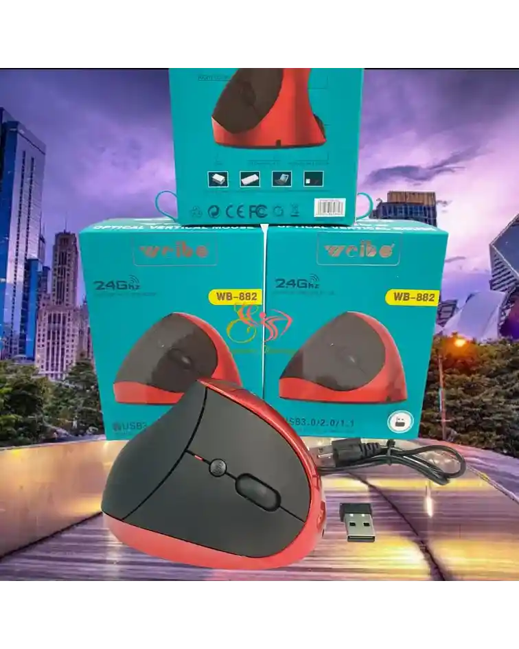 Modelo: Welbe WB-882. Tecnología: Inalámbrico, compatible con USB 3.0, 2.0 y 1.1. Diseño: Vertical para reducir la tensión en la muñeca y antebrazo. Uso: Diseñado para prevenir el síndrome del túnel carpiano al mantener una postura natural de la mano.