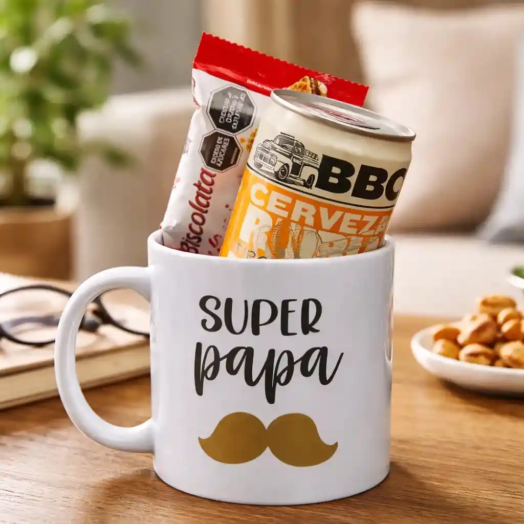Incluye: Mug pocillo día del padre, Cerveza lata y Biscolata