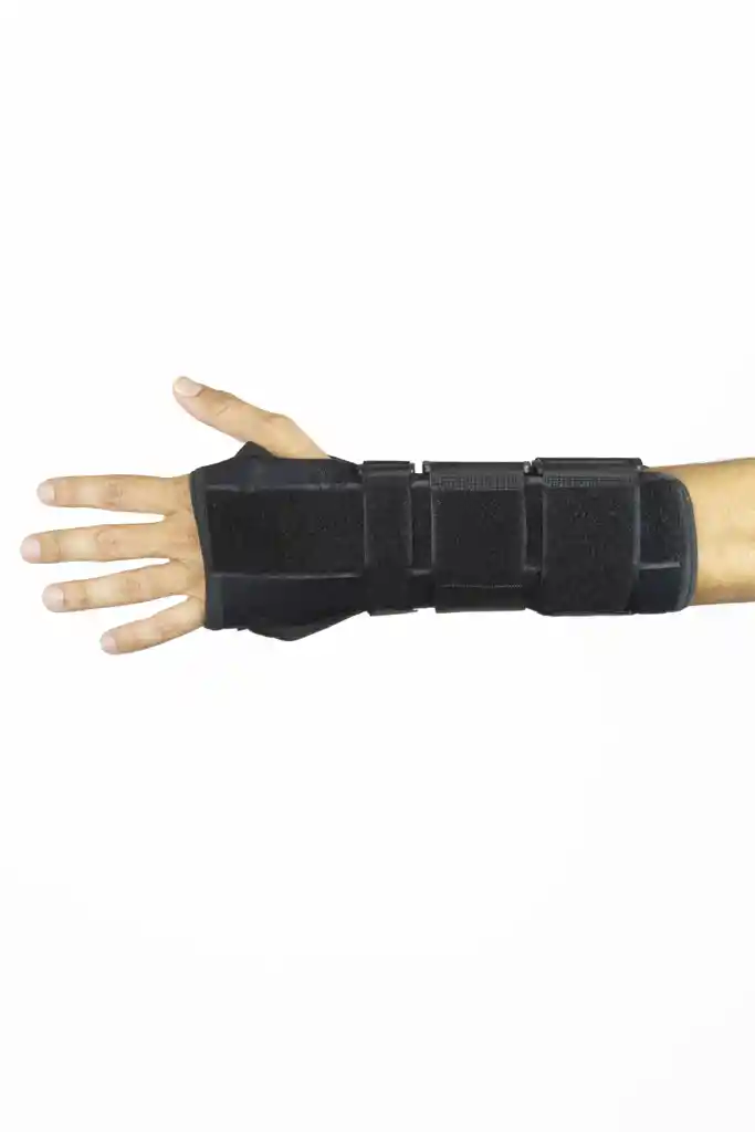 Dispositivo ortopédico diseñado para proporcionar una inmovilización firme y estable de la muñeca y el antebrazo. Cuenta con dos férulas internas que aseguran una correcta alineación y limitan el movimiento.