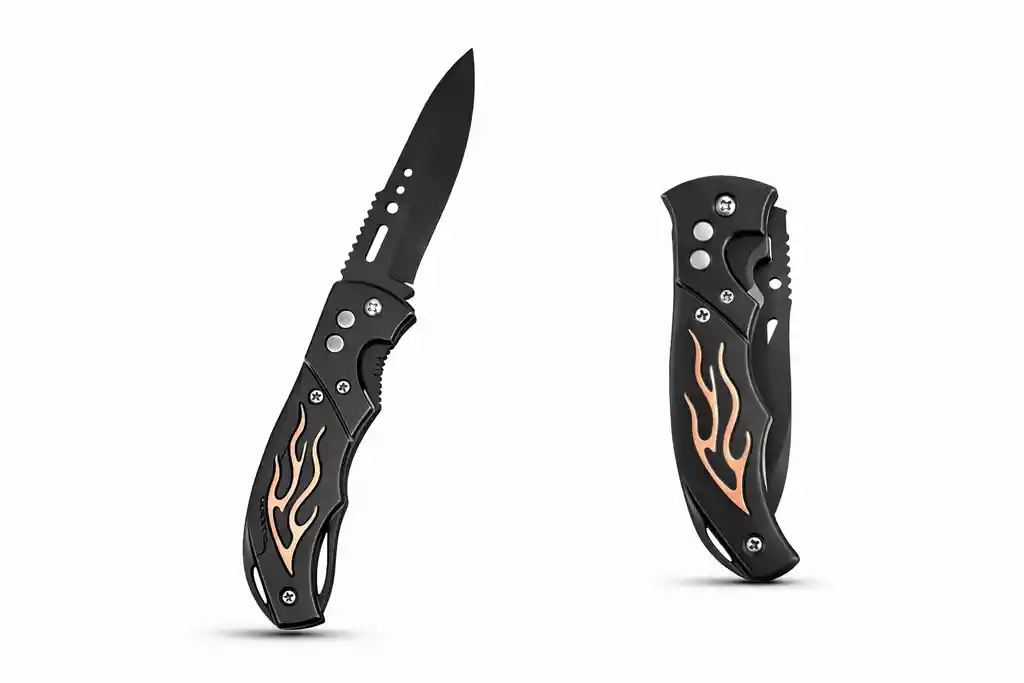 Hoja con filo liso y dentado diseño plegable compacto acabado negro mango con diseño tipo flama sistema de apertura rapida clip para bolsillo
