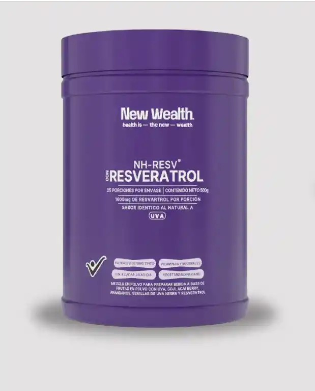NH-RESV® Resveratrol sabor uva es un alimento antioxidante con 1600 mg de resveratrol por porción. Ayuda a proteger tus células, apoyar el corazón y mejorar tu bienestar general. Ingredientes Uva, Goji, Acai Berry, Arándanos, Semillas de Uva Negra, Resveratrol, Nicotinamida Adenina Dinucleótido (NAD+), Fosfato Tricálcico, Sabor ídentico al natural, CMC (Estabilizante), Dióxido de Ttitanio, Vitamina C, Vitamina E, Vitamina B3, Colorante, Benzoato de Sodio, Vitamina B5, Vitamina B6, Vitamina B9, Vitamina B7 y Vitamina D3. Con NAD+ Vitaminas y minerales Sin azúcar añadida Libre de maltodextrina
