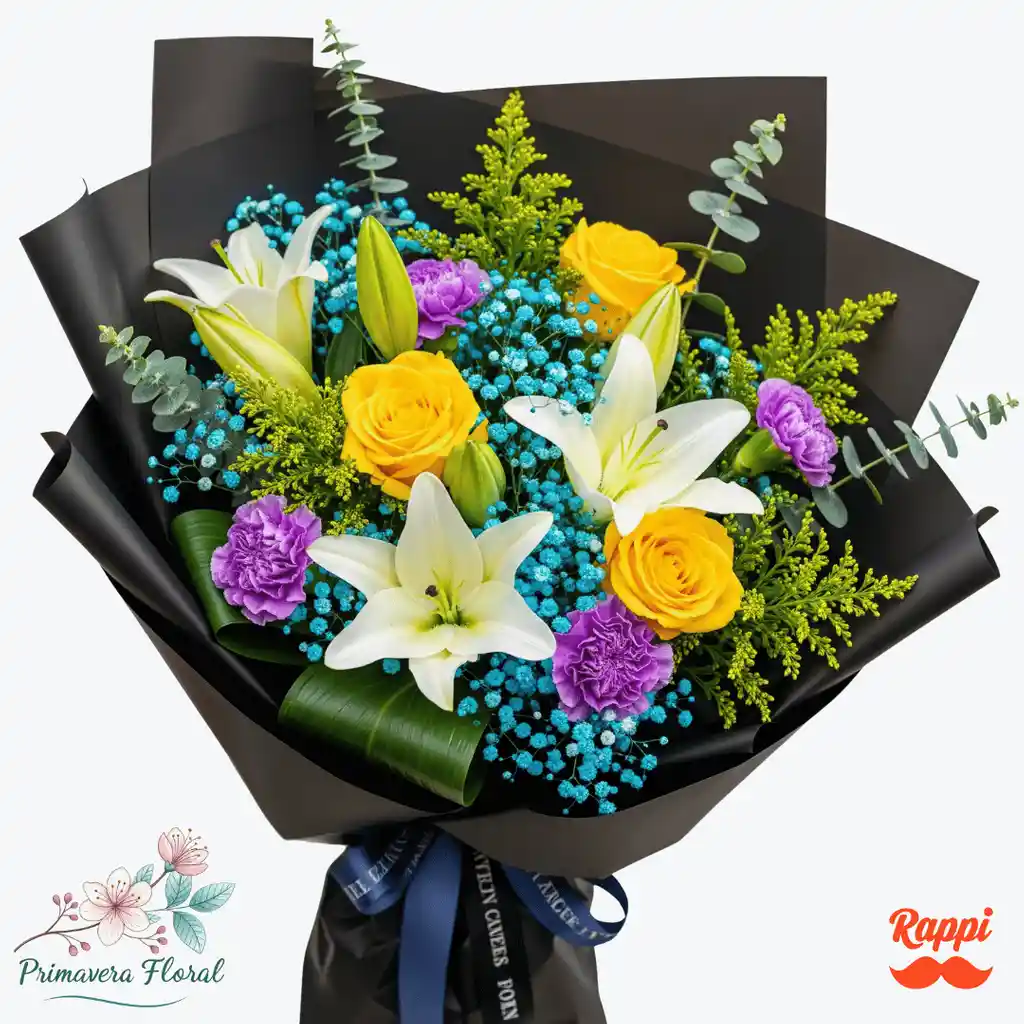 Un diseño floral equilibrado y lleno de frescura, que combina suaves tonos blancos con toques amarillos y morados. Este ramo contiene 7 rosas amarillas, 3 lirios blancos grandes, ramas de gipsófila azul, ramas de solidago, 6 claveles morados, 4ramas de eucalipto y ramas de rusco. Perfecto para regalar en cualquier ocasión y aportar elegancia y color con un estilo natural y refinado.