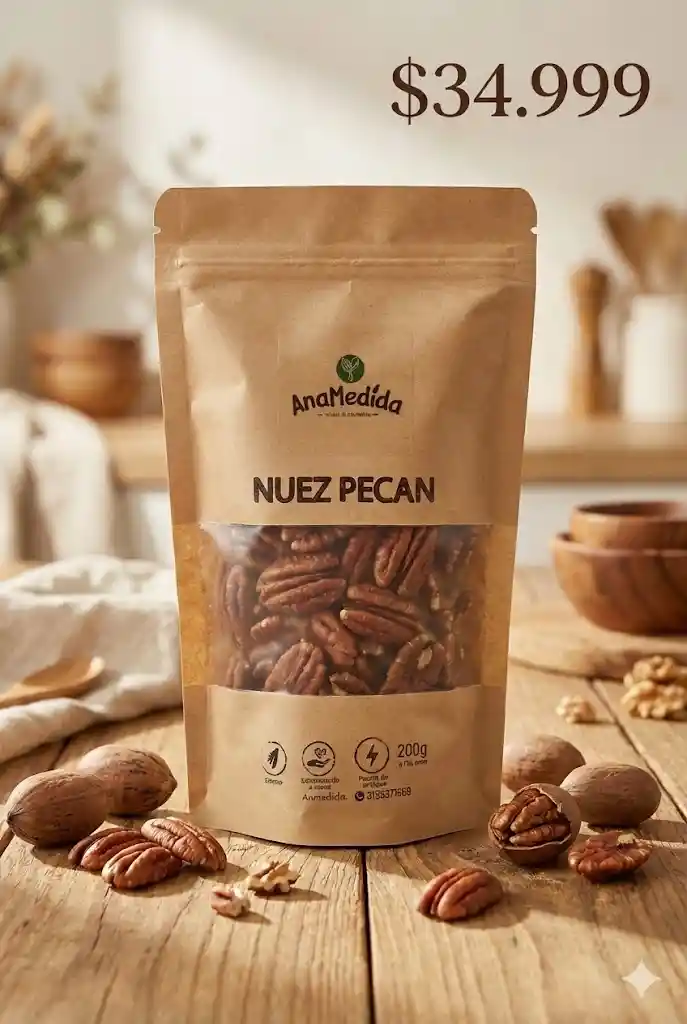 Nuez pecan 100% natural, crujiente y de sabor suave, sin sal añadida ni conservantes. Fuente natural de grasas saludables, antioxidantes y energía limpia. Ideal para snacks conscientes, desayunos, ensaladas, repostería o como complemento diario de una alimentación balanceada. Producto seleccionado cuidadosamente para garantizar frescura, textura y calidad premium.