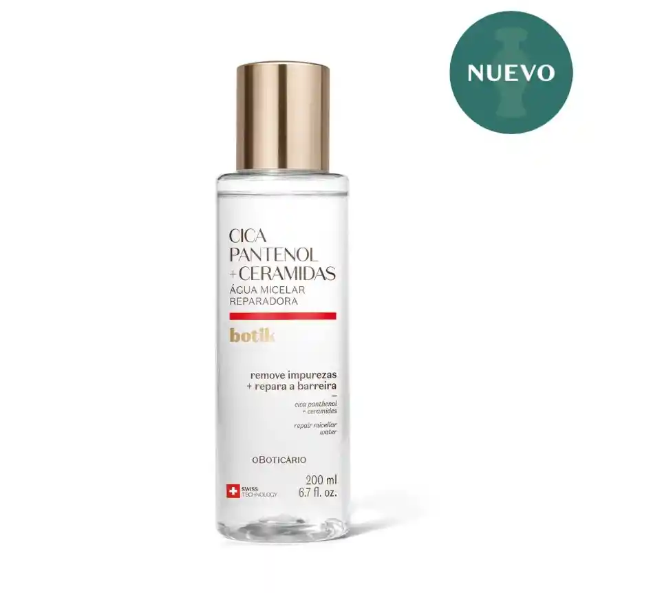 Para limpiar suavemente la piel más sensible, tenemos el agua micelar reparadora Cica Pantenol + Ceramidas Botik. Este producto elimina el maquillaje y las impurezas sin resecar la piel, reparando y fortaleciendo la barrera cutánea. La sensación que produce esta agua micelar para piel sensible es de calma y reducción del enrojecimiento causado por la resequedad. Su efecto se siente desde el primer uso.