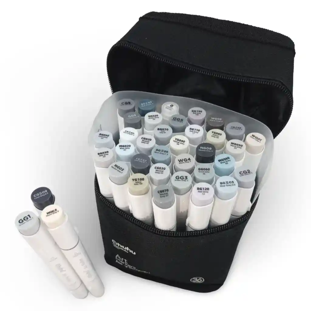 Marcadores de alcohol especializados en tonos grises con 36 variaciones. Punta biselada y pincel para máxima flexibilidad. Perfectos para ilustración en blanco y negro, sombreado y técnicas de tinta. Tinta fluida que permite degradados suaves y profesionales.