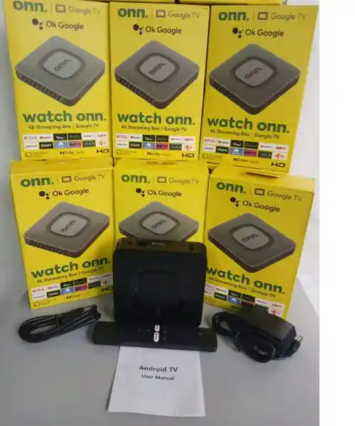 El producto en la imagen es un dispositivo de transmisión (streaming box) onn. 4K UHD con Google TV. Este dispositivo permite convertir un televisor en un centro de entretenimiento inteligente con acceso a diversas plataformas de streaming.