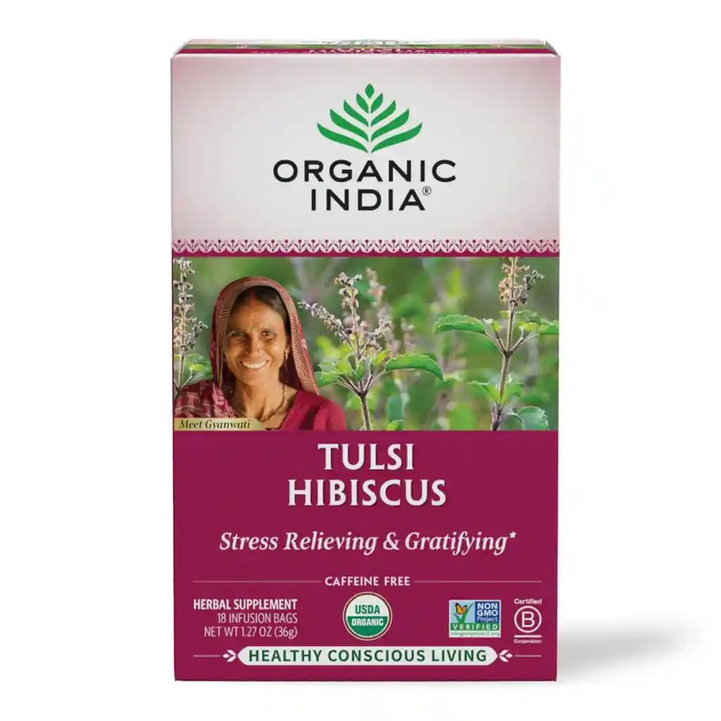 Organic India Té Herbal Tulsi Hibiscus combina la pureza del tulsi con el toque floral del hibiscus para brindar una infusión que ayuda a aliviar el estrés, promover la calma y ofrecer un potente aporte antioxidante natural. Su fórmula orgánica, libre de cafeína y elaborada con plantas certificadas, apoya el equilibrio emocional y contribuye al bienestar diario, ideal para quienes buscan un té que relaje, revitalice y fortalezca el sistema inmune de manera natural. Cada caja incluye 18 bolsitas con 1.27 oz (36 g), perfectas para una rutina saludable.