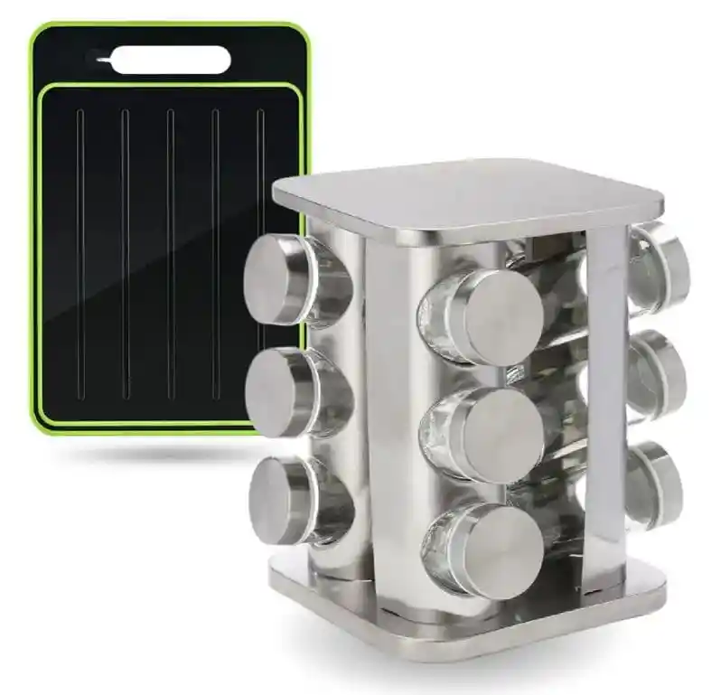 ¿Cansado de buscar entre frascos desordenados mientras cocinas? ¿Olvidaste sacar la carne del congelador a tiempo? Este combo de es la solución definitiva para una cocina moderna, organizada y eficiente. ¿Qué incluye este Kit Premium? 1. Especiero Giratorio de Lujo (12 Frascos): Acceso 360°: Encuentra cualquier condimento en segundos gracias a su base giratoria suave. Diseño Elegante: Fabricado en Acero Inoxidable de alta calidad que aporta un toque minimalista y profesional a tu hogar. Frascos de Vidrio de 90ml: Conservan el sabor y aroma original de tus especias. Incluyen tapa con cierre giratorio para dosificar con precisión. Ahorro de Espacio: Su diseño cuadrado vertical optimiza cada centímetro de tu mesón. Tabla de Corte y Descongelado 4 en 1: Tecnología de Descongelado: Descongela carnes y alimentos hasta 3 veces más rápido de forma natural, sin electricidad ni microondas. Multifuncional: No es solo una tabla; incluye superficie de corte, área de rallado (para ajos o jengibre) y afilador de cuchillos integrado. Higiene Total: Bordes antiderrames y material fácil de lavar.