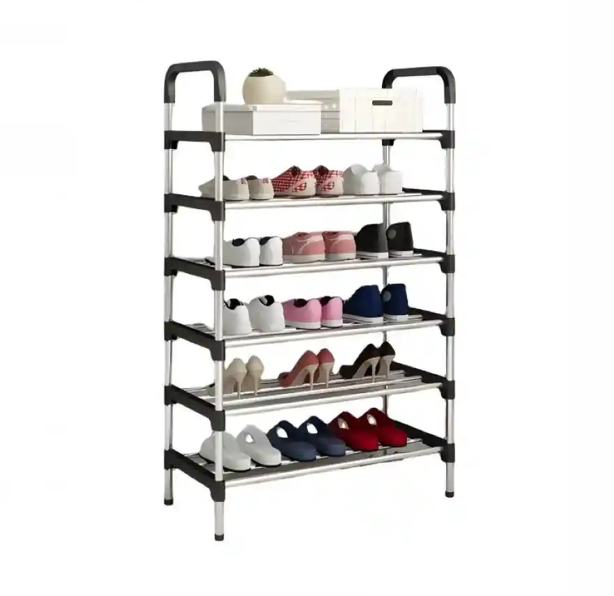 Organizador de Zapatos Metalico 6 Niveles Zapatero. CARACTERISTICAS: * Organizador de zapatos metálico de 6 niveles * Estructura de metal de alta resistencia al peso, combinado de uniones plásticas. * Tiene capacidad de 12 hasta 18 pares de zapatos dependiendo del tamaño. * Este modelo destaca por su diseño armable, lo que facilita su montaje y adaptación a diferentes espacios DESCRIPCION: - Organiza tu espacio con el Organizador de Zapatos Estante Zapatero Armable de 6 Niveles . Este práctico zapatero es ideal para quienes buscan maximizar el almacenamiento en su hogar, ofreciendo una solución eficiente y elegante para mantener tus zapatos en orden. - Con seis estantes, tendrás suficiente espacio para tus zapatos favoritos, desde zapatillas deportivas hasta tacones elegantes. - Hecho con láminas de aluminio para dar mayor resistencia al peso, combinado de uniones plásticas, capacidad para 12 hasta 18 pares de zapatos de tallas para adulto y hasta 18 de tallas más pequeñas, fácil y rápido armado, ideal para organizar el closet y mantener los zapatos en buen estado cuando están guardados. - Cuidado producto: Realizar un mantenimiento periódico limpiando y secando el producto. La limpieza del producto se debe hacer únicamente con un paño suave. Nunca utilice abrasivos, esponjillas o elementos que puedan rayar la superficie del producto. ESPECIFICACIONES: * Material: ABS/ Varillas Aluminio. * Medidas: 60x30x110 cm.