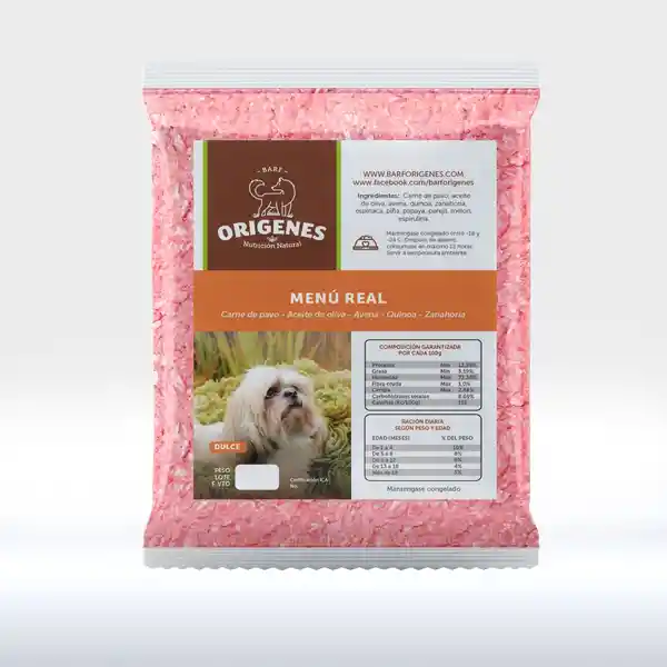 Orígenes Menú Real Pavo Elaborado a Base de Carne de Pavo Magra Enriquecido Con Verduras Frutas Fibras Aceites y Suplementos Ideal Para Perros Con Sobrepeso Intolerancia Alimentaria Alergias Apto Para Perros Senior Fácil Digestión Sin Colorantes Azucares Harinas Cárnicas ni Saborizantes. 500 Gr