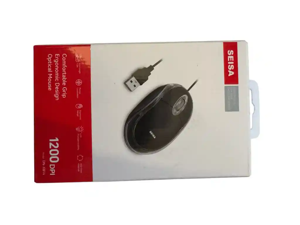 Mouse Seisa alámbrico 1200 DPI. Diseño ergonómico, agarre cómodo y sensor óptico preciso para un control suave en trabajo o estudio. Compatible con cualquier PC o portátil.