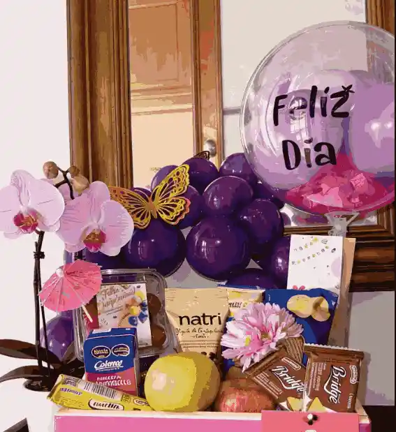 Contenido: 1 Bandeja de desayuno + 1 Orquídea Morada Phanaelosis 2 Varas 1 Jugo de Naranja 1 Yogurt Parfait 1 Bandeja de Ciruelas 1 Papas de Paquete 1 Ramito de Flores 2 Manzanas 1 Maní Frutos secos 2 Galletas 1 Sándwich: Jamón, queso vegetales. 1 Bandeja de Madera Mdf 1 Tarjeta Personalizada