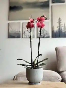 Hermosa orquídea natural color salmón ( Altura promedio 70 cm ) INCLUYE CAJA Incluye: Portamaceta MARMOLIZADA con plato Tarjeta personalizada ( Por favor escribir en el chat) Tarjeta de cuidados NOTA: Todas las plantas son únicas, por lo que pueden presentar diferente número de botones, flores y cambio de altura a la fotografía de referencia.