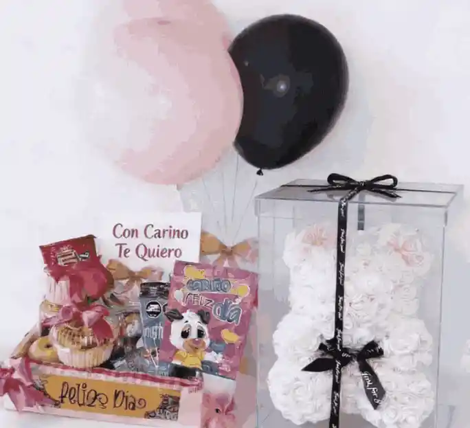 Contenido: 1 Oso de Rosas + Ancheta 1 Mini Postre 1 Mani 2 Barra de Granola 2 Galletas 8 Mini Donas 2 Manzanas 1 Chocolate Grande 1 Bandeja de Fresas