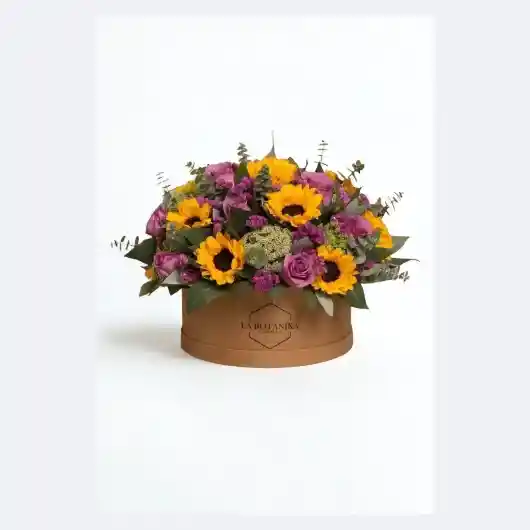 Caja de 10 girasol mini 12 rosas morada Nota: La flor puede ser sustituida dependiendo la disponibilidad de color y del producto “Mensaje Personalizado” máximo de 30 caracteres (Dejar el mensaje en el chat, los comentarios no se previsualizan para la tienda por lo que si se dejan allí no podrá ser incluido).