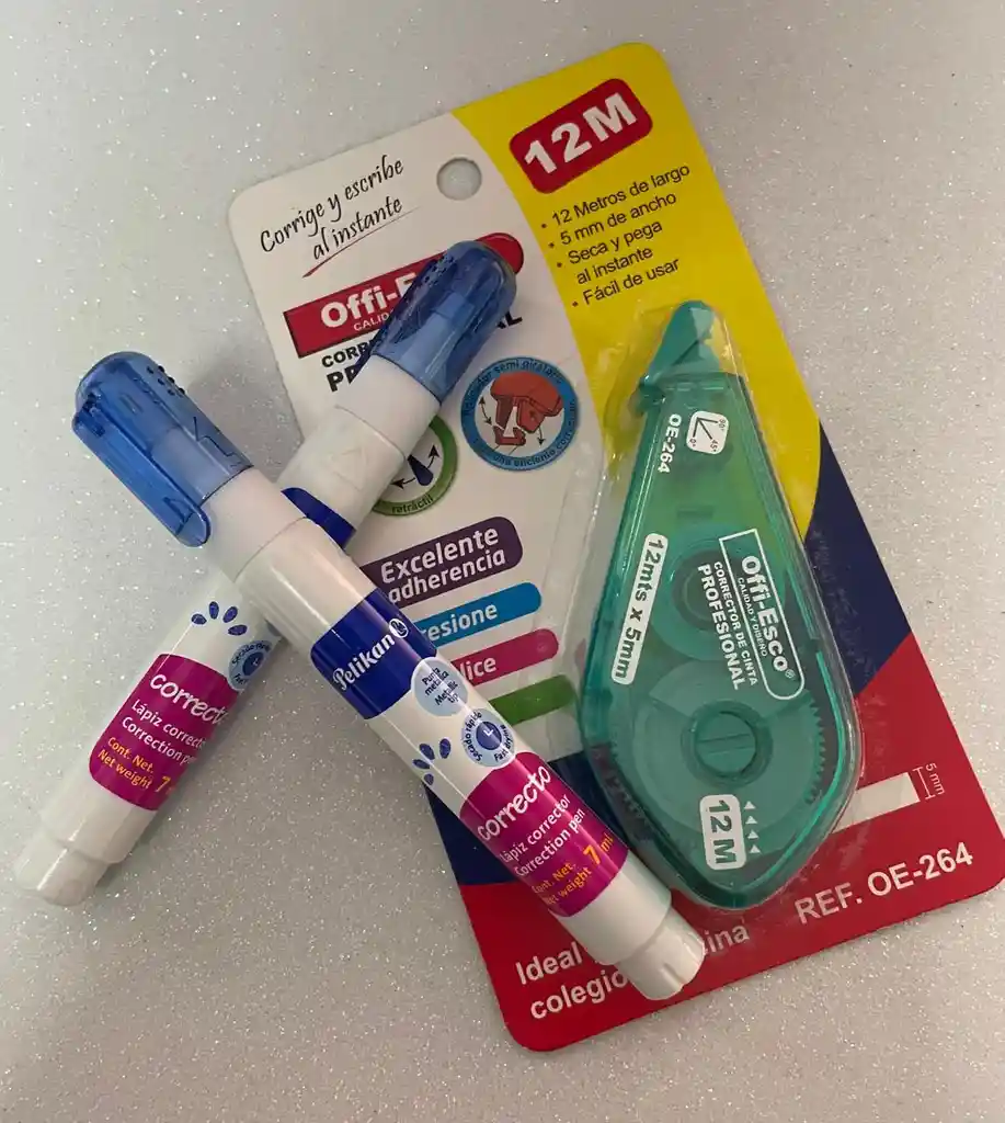 ¡El combo definitivo para una oficina sin tachones! 🧼🖊️🏢 En IMPREKOLOR SAS entendemos que el trabajo bien hecho no admite errores. Con este Pack x3, aseguras tener siempre a la mano la mejor tecnología de corrección para tus documentos, tareas o cuadernos personalizados. ✨¿Qué incluye tu Pack de Oficina? 👌1 Cinta Correctora Offi-Esco : Corrección en seco que te permite escribir encima al instante. ¡Son 12 metros de cinta de alta calidad!. 👌2 Lápices Correctores Pelikan (7 ml) : Ideal para esos detalles pequeños que requieren máxima precisión gracias a su punta metálica. ✨Doble Tecnología: Tienes cinta para líneas largas y líquido para puntos específicos. 📲 315 388 0960