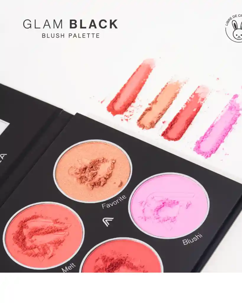 Nuestra paleta de rubores Glamblack tiene alta pigmentación con 4 tonos compactos ideales para darle color a tu rostro, tres de ellos son en acabado mate y uno satinado.