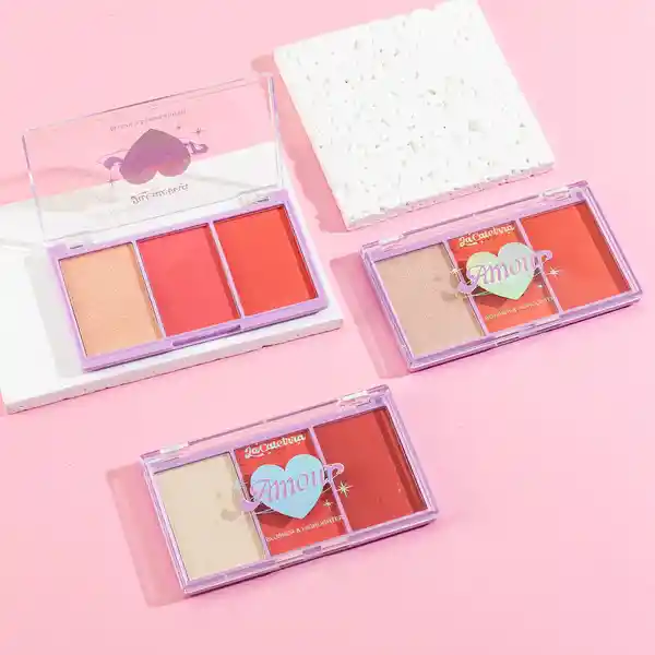 Esta es una paleta de rostro "Amour" de La Catrina, diseñada para un acabado profesional y radiante. Aquí tienes sus características y una descripción estratégica para promocionarla: Características del Producto Marca: La Catrina. Contenido: Es una paleta multifuncional que incluye Blusher & Highlighter (Rubor e Iluminador). Variedad de Tonos: Dos Rubores: Uno en tono terracota/ladrillo y otro en tono rosado profundo, ideales para dar calidez y dimensión a las mejillas. Un Iluminador: Tono champaña con destellos finos para resaltar los puntos altos del rostro (pómulos, arco de cupido y punta de la nariz). Empaque: Estuche rectangular transparente con un diseño holográfico de corazón, lo que la hace muy atractiva visualmente y fácil de identificar en tu colección. Textura: Polvos finamente compactados que prometen una fácil difuminación sobre la piel.