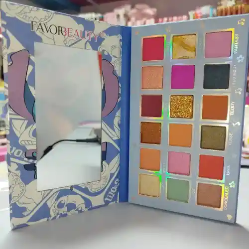 La paleta Stitch de Favor Beauty es una paleta de maquillaje versátil con temática de Stitch que incluye sombras ideal para crear looks de día o de noche. Se caracteriza por su buena pigmentación y su diseño compacto. -Contenido Completo: Esta paleta multifuncional a menudo incluye una combinación de sombras de ojos (en acabados mate, shimmer y glitter) -Variedad de Tonos: Las paletas suelen ofrecer una gama de colores, desde tonos neutros y terrosos hasta opciones más vibrantes y coloridas, como turquesas, rosas y púrpuras, inspirados en el personaje.