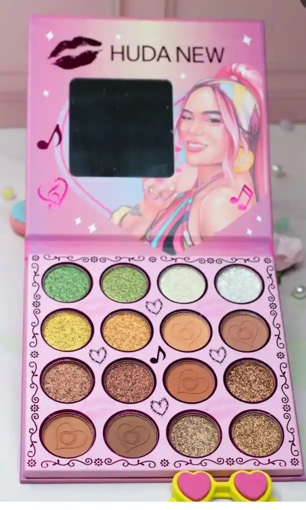 paleta de sombras de ojos que parece ser una imitación o una versión inspirada en la marca Huda new, con la imagen de la cantante Karol G en la tapa. La paleta contiene una variedad de tonos, incluyendo acabados mate y brillantes. Presenta 15 tonos diferentes, con una gama de colores que van desde verdes y dorados hasta tonos neutros y marrones. El empaque es de color rosa y cuenta con un espejo en la tapa, junto con la imagen de la artista Karol G.