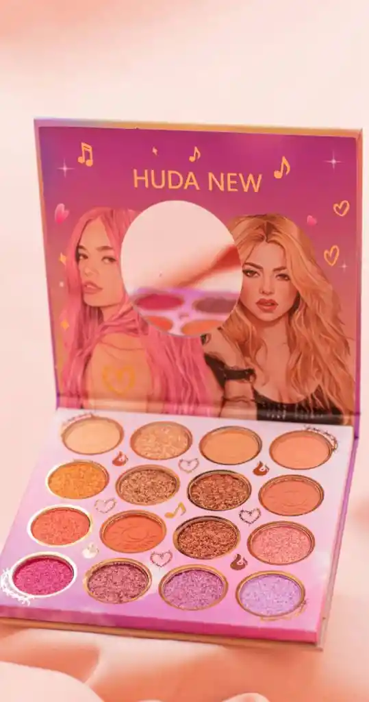 a imagen muestra una paleta de sombras de ojos, identificada como la paleta de sombras de ojos "Huda New" con 16 tonos. La paleta contiene una variedad de tonos, incluyendo acabados mate y brillantes. Las sombras están formuladas para ofrecer una pigmentación intensa y de larga duración. La textura de las sombras es suave y sedosa, lo que facilita su aplicación y difuminación. Algunas versiones de esta paleta presentan un diseño con las imágenes de Karol G y Shakira.