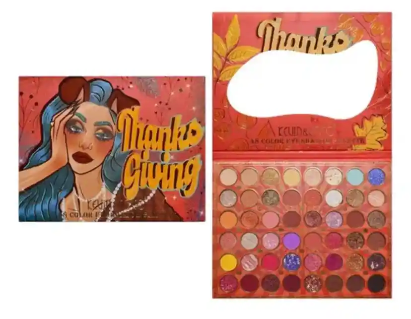 La imagen muestra la paleta de sombras de ojos de 48 colores de Kevin & Coco. Es una paleta de sombras de ojos con una variedad de tonos, que incluye colores neutros, brillantes y con purpurina. Las sombras de ojos prensadas son un tipo popular de cosmético que se aplica en los párpados para añadir color y dimensión. La paleta tiene un diseño exterior con motivos de hojas en tonos cálidos y un espejo en el interior. La durabilidad de las sombras de ojos en polvo suele ser de 2 a 3 años.