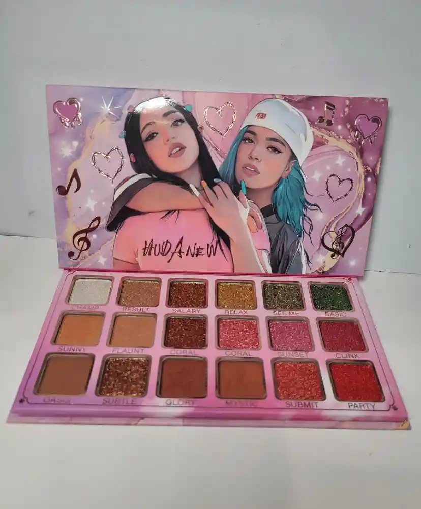 Paleta de Sombras Huda New ✨ Dale un toque de brillo y color a tu mirada con esta hermosa paleta de 18 tonos únicos. Combina sombras mates, satinadas y metalizadas que te permiten crear desde looks naturales hasta los más intensos y llamativos. 🎨 Tonos destacados: • Nudes suaves para el día (Sunny, Flaunt, Mystic). • Brillos dorados y cobrizos para un toque glam (Result, Salary, Relax). • Colores vibrantes para resaltar (Sunset, Party, Clink). 💖 Características: • Alta pigmentación y fácil difuminado. • Ideal para todo tipo de piel. • Diseño artístico con tapa ilustrada que resalta estilo y creatividad. • Perfecta para uso diario o profesional.