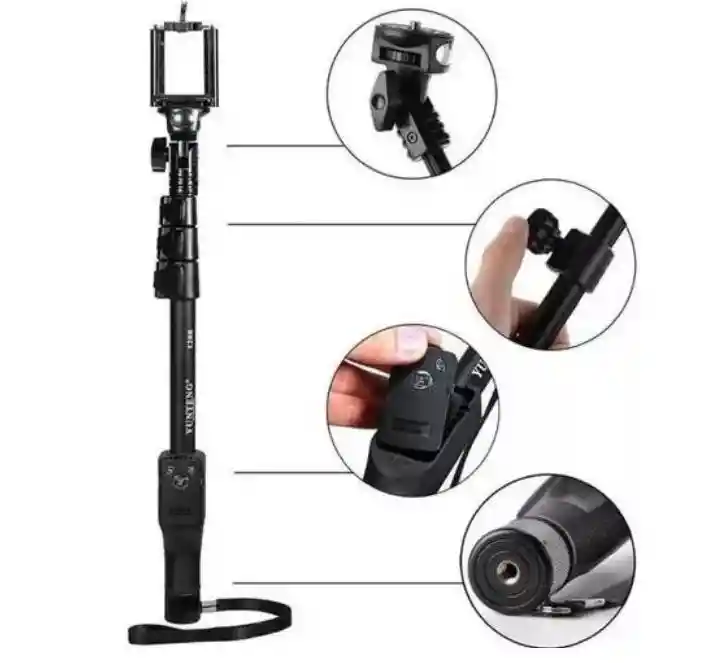 Es un dispositivo 3 en 1, que funciona como monopié, trípode y cuenta con un control remoto Bluetooth extraíble. El material principal es aleación de aluminio, lo que le da consistencia y durabilidad. El control remoto Bluetooth es recargable y se conecta al teléfono para tomar fotos o grabar videos a distancia. Tiene una longitud máxima extendida de aproximadamente 128 cm. El cabezal es giratorio en 360° y cuenta con un tornillo universal de 1/4 de pulgada para montar cámaras pequeñas o accesorios adicionales como luces o micrófonos.