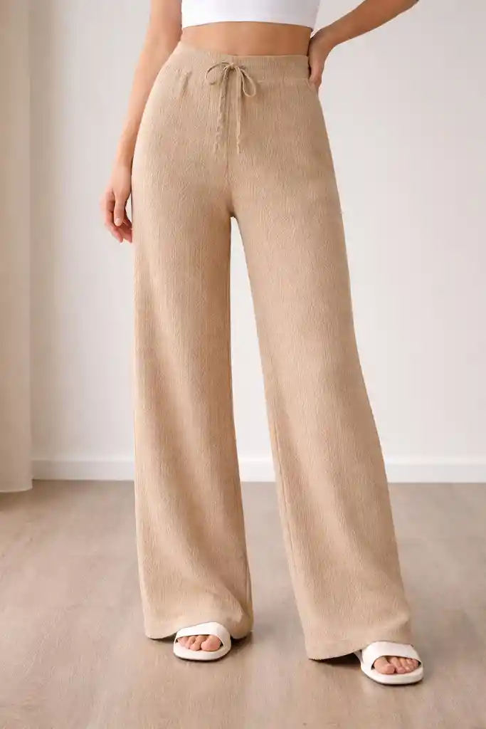 Pantalón ancho en tejido suave con textura sutil y diseño fluido que estiliza la silueta. Cuenta con tiro alto y pretina elástica con cordón ajustable para mayor comodidad. Ideal para looks casuales o elegantes, combinando fácilmente con tops y sandalias o tenis. Perfecto para cualquier temporada.