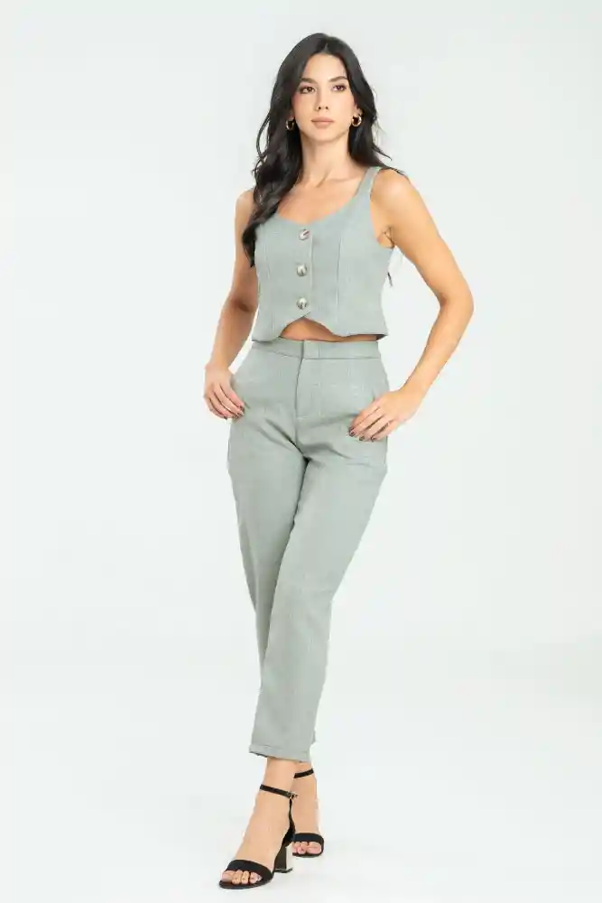 Pantalón tobillero en tejido plano, pretina que ajusta con gancho sastre, botón interno y cierre, bolsillos laterales y de ribete en posterior.