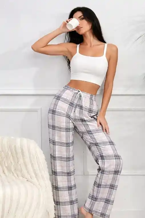 Pantalón Lounge Cuadros Mujer – Tela Suave Semibrillante Talla M