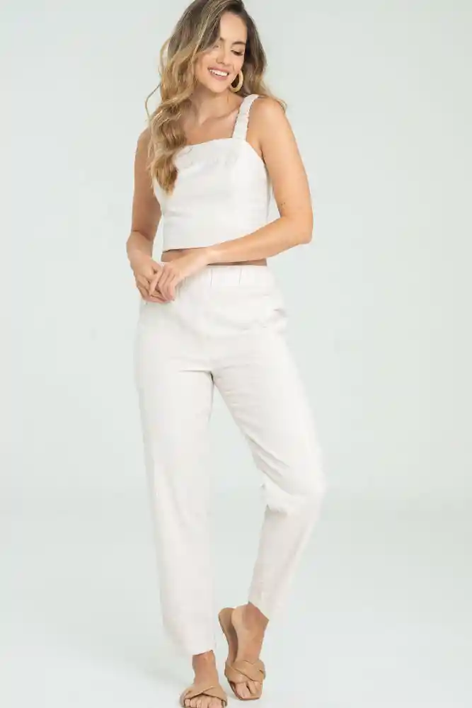 Pantalón en tejido plano fondo entero tipo lino,pretina enresortada con elástico de 5cms, cortes tanto en delantero como en posterior, bolsillos con boca redonda que va desde el delantero hasta el posterior, tobillero, ruedo de 2cms, silueta semi ajustada