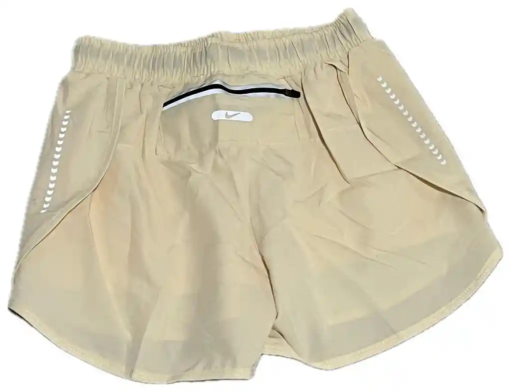 Pantaloneta deportiva dama con licra interna, material poliéster iimpermeable, color beige, talla L