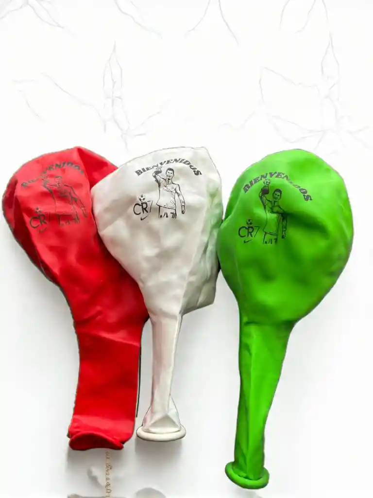 PAQUETE POR 20 UNIDADES DE GLOBOS BOMBAS R-12 MOTIVO BIENVENIDOS CR7 COLORES VERDE, BLANCO Y ROJO