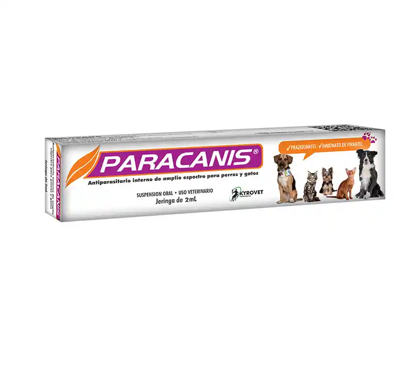 El Praziquantel, es un compuesto de excelente actividad contra todo tipo de tenias y de amplio margen de seguridad en las especies para las cuales está indicado. El Praziquantel se absorbe en forma rápida y completa, los niveles máximos se presentan en los perros a las 2 horas; se distribuye a todos los órganos e inclusive sobrepasa la barrera hematoencefálica. Esta excelente distribución le permite una gran actividad contra los estados larvarios y adultos del parásito en diferentes sitios del organismo. Su principal sitio de metabolismo es el hígado. Embonato de Pirantel ejerce su actividad principalmente contra los vermes redondos, tales como el Ancylostoma spp. y los Ascaris spp. También posee amplio margen de seguridad. La asociación de estos dos antihelmínticos, da origen a un amplio espectro contra las parasitosis intestinales más comunes de los perros y gatos.