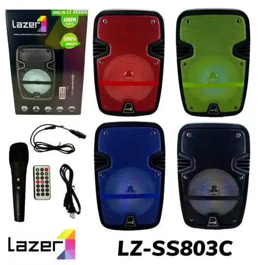 Este parlante portátil de la marca Lazer ofrece potencia y versatilidad en un diseño compacto de 31 cm de alto. Con una potencia máxima de 4800W P.M.P.O, reproduce audio con claridad y volumen suficiente para llenar espacios medianos y grandes. La estructura robusta con rejilla metálica protege los componentes internos mientras mantiene un estilo moderno. El sistema de conectividad múltiple permite reproducir música desde cualquier fuente: Bluetooth para dispositivos móviles, entrada USB para memorias, y radio FM integrada para escuchar estaciones locales. La batería recargable interna proporciona autonomía para horas de uso sin necesidad de cables de corriente. Características Principales: Potencia máxima: 4800W P.M.P.O Conectividad Bluetooth para dispositivos inalámbricos Entrada USB para reproducción desde memorias Radio FM integrada con sintonizador digital Batería recargable de larga duración Micrófono con cable incluido para karaoke Control remoto completo con todas las funciones Cuatro colores disponibles: Rojo, Azul, Negro, Verde Dimensiones compactas: 19 x 31 cm Asas laterales para fácil transporte Incluye en la Caja: 1 Parlante portátil Lazer LZ-SS803C 1 Micrófono con cable 1 Control remoto con batería 1 Cable de carga para la batería interna Manual de instrucciones Especificaciones Técnicas: Modelo: LZ-SS803C / LZ-803 Potencia: 4800W P.M.P.O (Peak Music Power Output) Dimensiones: 19 cm de ancho x 31 cm de alto Conectividad: Bluetooth, USB, Radio FM Alimentación: Batería recargable interna / Corriente alterna Colores disponibles: Rojo, Azul, Negro, Verde Marca: Lazer Electronics