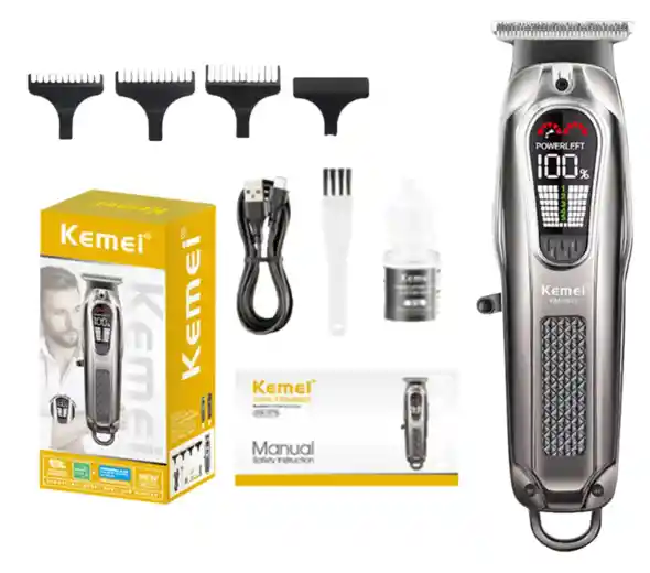La KEMEI KM-1675 es una patillera profesional premium con un diseño moderno y elegante. Perfecta para definir líneas limpias, patillas, contornos, fades y detalles finos con gran precisión. Su cuerpo metálico, pantalla LED con luz RGB y hoja profesional la convierten en una de las patilleras más completas y vistosas de la marca KEMEI. Características principales: Marca: KEMEI Modelo: KM-1675 Cuerpo metálico premium con acabado brillante Pantalla LED digital grande con luz RGB (cambia de color) Indicador “POWER LEFT” con porcentaje de batería 5 velocidades ajustables Hoja profesional de doble uso (corte de cabello y barba) Batería de litio de 1800mAh Hasta 270 minutos de uso continuo Carga rápida por USB Diseño ergonómico con asa superior Incluye en el paquete: 1 Patillera KEMEI KM-1675 3 Guías de peine (peines de diferentes longitudes) 1 Aceite lubricante 1 Cepillo de limpieza 1 Cable de carga USB Usos ideales: Definición precisa de patillas y contornos Líneas rectas y diseños de fade Detalles finos en barba y cabello Uso profesional en barberías o uso personal diario Ventajas: Pantalla LED grande y llamativa con luz RGB Excelente autonomía de batería (hasta 4.5 horas) Cuerpo metálico resistente y elegante 5 niveles de velocidad ajustables Corte suave y preciso ¡Una patillera con estilo, potencia y precisión que destaca tanto por su rendimiento como por su diseño!