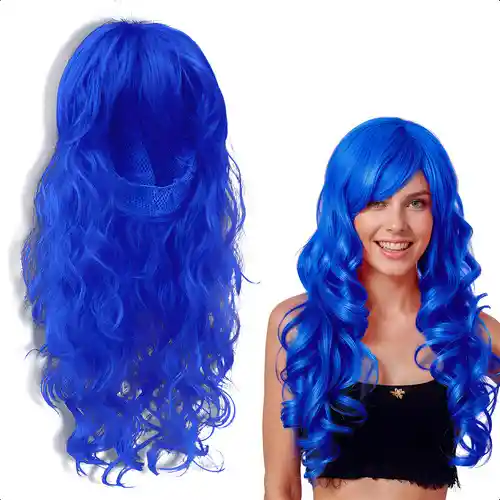 Peluca Sintética Ondulada Con Capul Color azul Ondulada Largo 60 cm