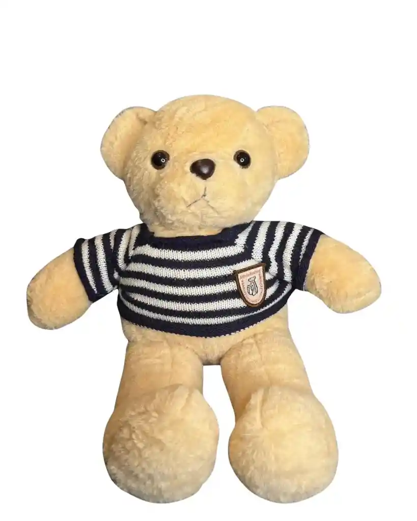 Un oso de peluche de color beige con una expresión amigable, vestido con un suéter de rayas azules marino y blancas con un escudo bordado . El oso puede ser sustituido dependiendo la disponibilidad de color y del producto “Mensaje Personalizado” máximo de 30 caracteres (Dejar el mensaje en el chat, los comentarios no se previsualizan para la tienda por lo que si se dejan allí no podrá ser incluido).