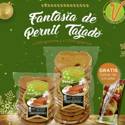 Producto 100% vegetal; Producto de Temporada Navideña. Fina proteína vegetal seleccionada (quinua, soya, amaranto, trigo) relleno con verduras habichuelas, zanahoria, uvas-ciruelas pasas, nueces, especias finas y sal. Presentación: APANADO - MOLDEADO / Entero 500 gramos (8 tajadas x libra)