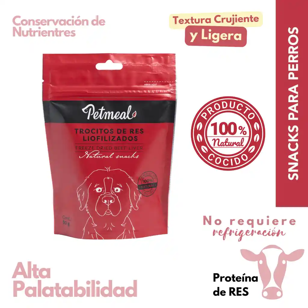Es hígado de res cuidadosamente cocido y deshidratado. Del tamaño de un bocado, son ligeros y crocantes. Elabo...Ver más