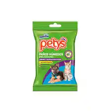 Petys Paños Húmedos son toallitas para la limpieza diaria de perros y gatos, ideales para retirar suciedad, residuos y malos olores del pelaje sin necesidad de baño. Su fórmula dermatológicamente probada y sin alcohol ayuda a cuidar el pH de la piel mientras desodoriza con una fragancia suave. Son una opción práctica para usar entre baños o al regresar de paseos. - Limpian sin enjuague y refrescan al instante - Ayudan a eliminar suciedad, residuos y malos olores del pelaje - Fórmula sin alcohol, dermatológicamente probada y apta para pieles sensibles - Con vitamina E, D-pantenol y aloe vera que aportan suavidad y brillo - Paños resistentes y suaves para uso frecuente