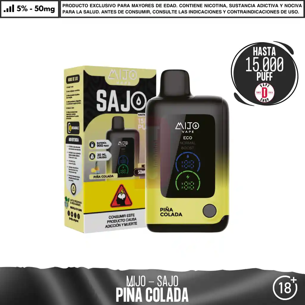 Mijo - Sajo 15000 PUFF. Contenido del paquete:1 dispositivo desechable Concentración de nicotina: 5% de nicotina salina en peso Características del dispositivo: Dispositivo de vapeo desechable Material: Aluminio + PVC + Silicona 3 modos de potencia 20 ml de capacidad 5% de sal nicotina = 50mg / ml 1 dispositivo por paquete Batería: 650 mAh 15000 caladas aproximadamente en modo ECO. Ingredientes: Glicerina Vegetal, Propilenglicol, Aromatizantes Naturales y Artificiales, Ácido Benzoico, Nicotina. Advertencia: Contiene nicotina. Producto para mayores de 18 años. Consulte contraindicaciones antes de consumir.