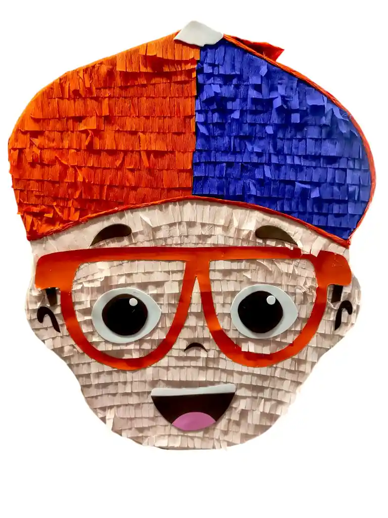 piñata de Blippi aventuras color naranja, azul y naranja alto de 52 cm ancho de aproximadamente 40 cm varia por la figura en algunas partes de fondo tiene 12 cm trae la abertura para poner tu relleno ideal trae una cuerda para colgar largo de 39 cm ideal para tus celebraciones si deseas algo adicional indicanos y con gusto te colaboramos