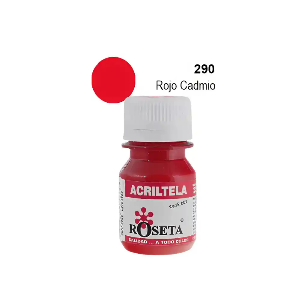 Pintura acrílica textil Roseta con capacidad de 30cc. Colores vivos, acabado mate, alta adherencia y resistencia al lavado y la luz. Ideal para aplicar sobre telas de algodón, dacrón y lino}